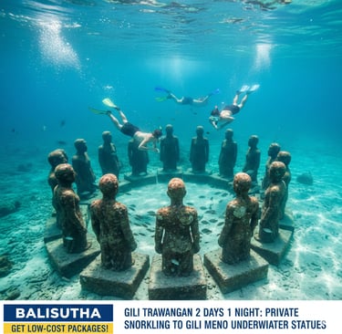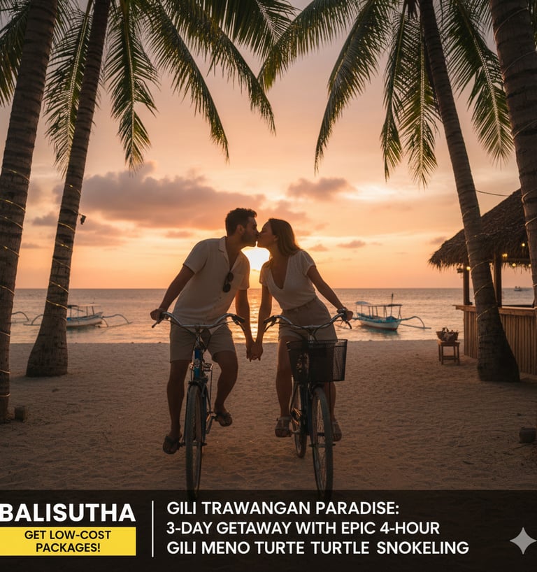 Gili Meno (The Serene Sanctuary): The ultimate romantic escape. Home to the world-famous underwater statues and turtle sanctuaries, Meno is the quietest of the three—a place to reconnect with nature and your loved ones in total privacy.